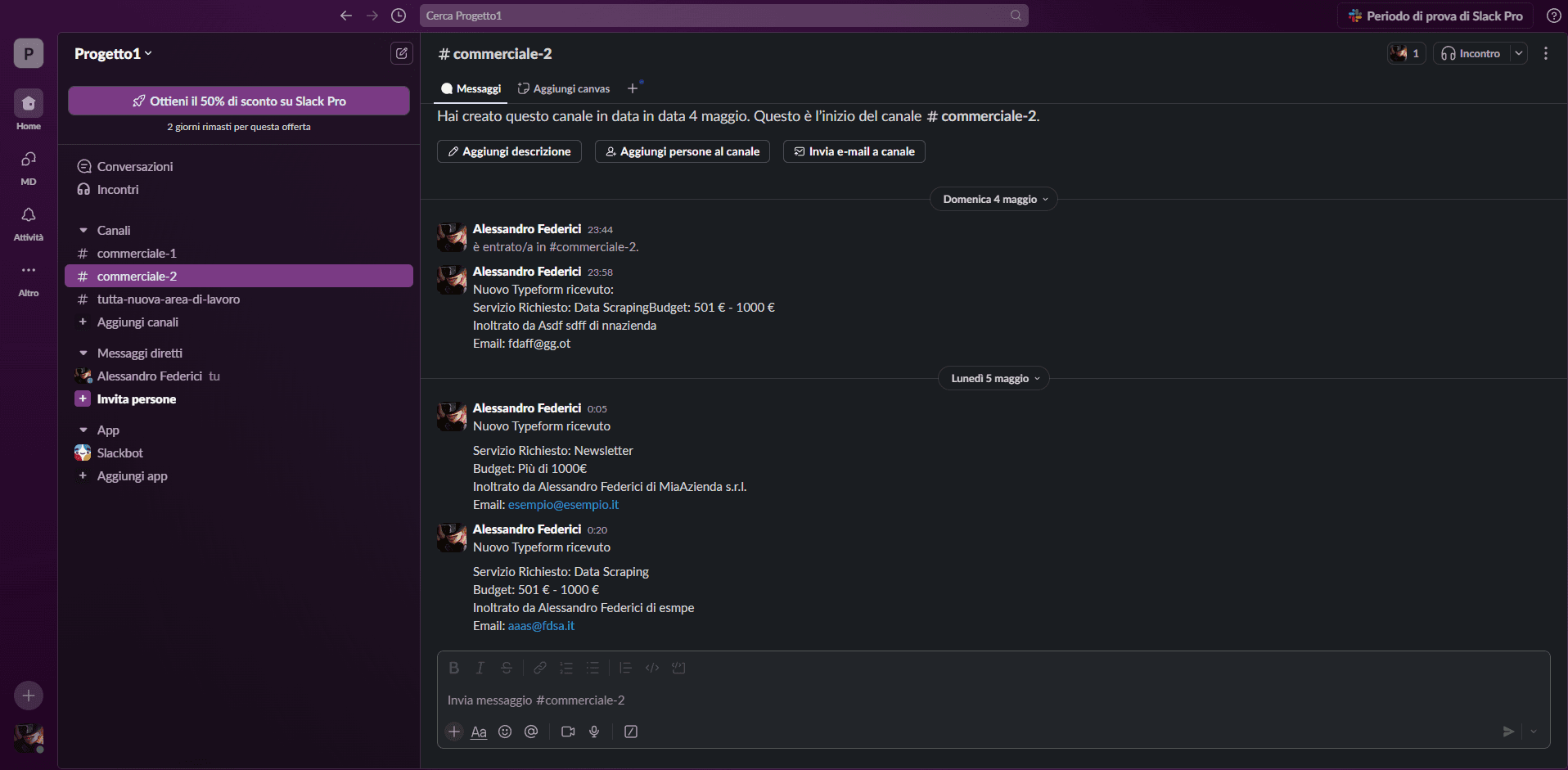 Based on the answer to the monthly budget question, a Slack notification is sent to the appropriate sales rep: