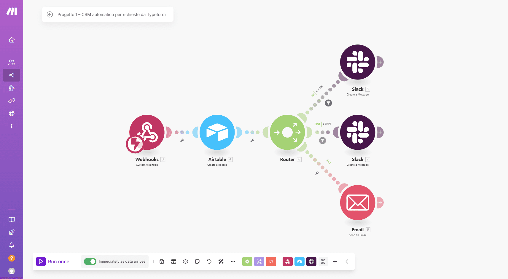 An automated system that handles incoming leads from Typeform, stores them in Airtable, notifies the right sales rep via Slack, and sends a personalized thank-you email to the client.