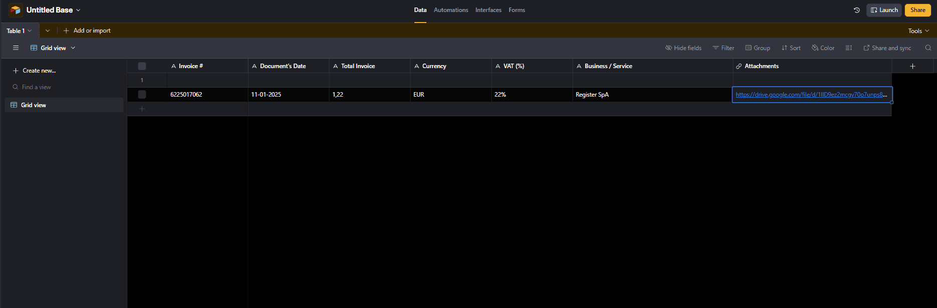 The model identifies and structures the key information β invoice number, total amount, currency, VAT, date, and service name β returning clean JSON data via the Output Parser.Data Storage in Airtable