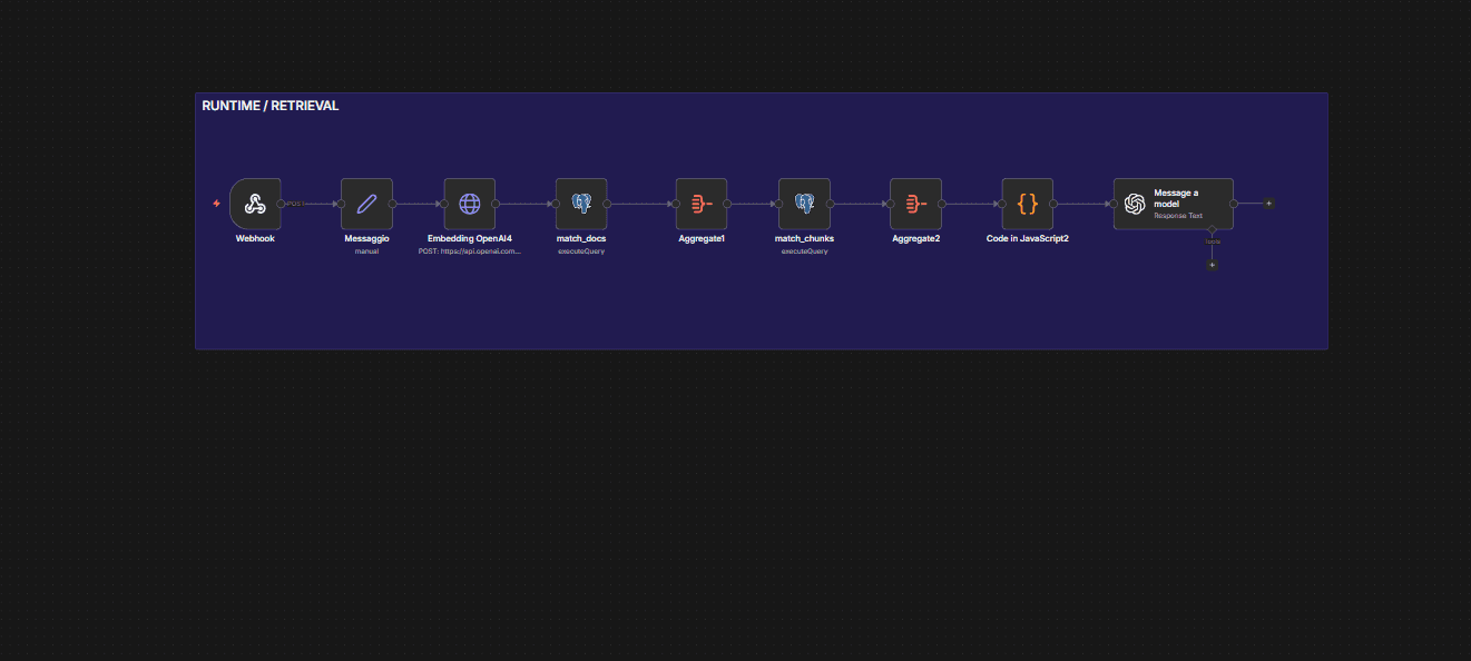 The entire pipeline — ingestion, embeddings generation, deduplication, and retrieval — is orchestrated using n8n, creating a maintainable and scalable automation system.