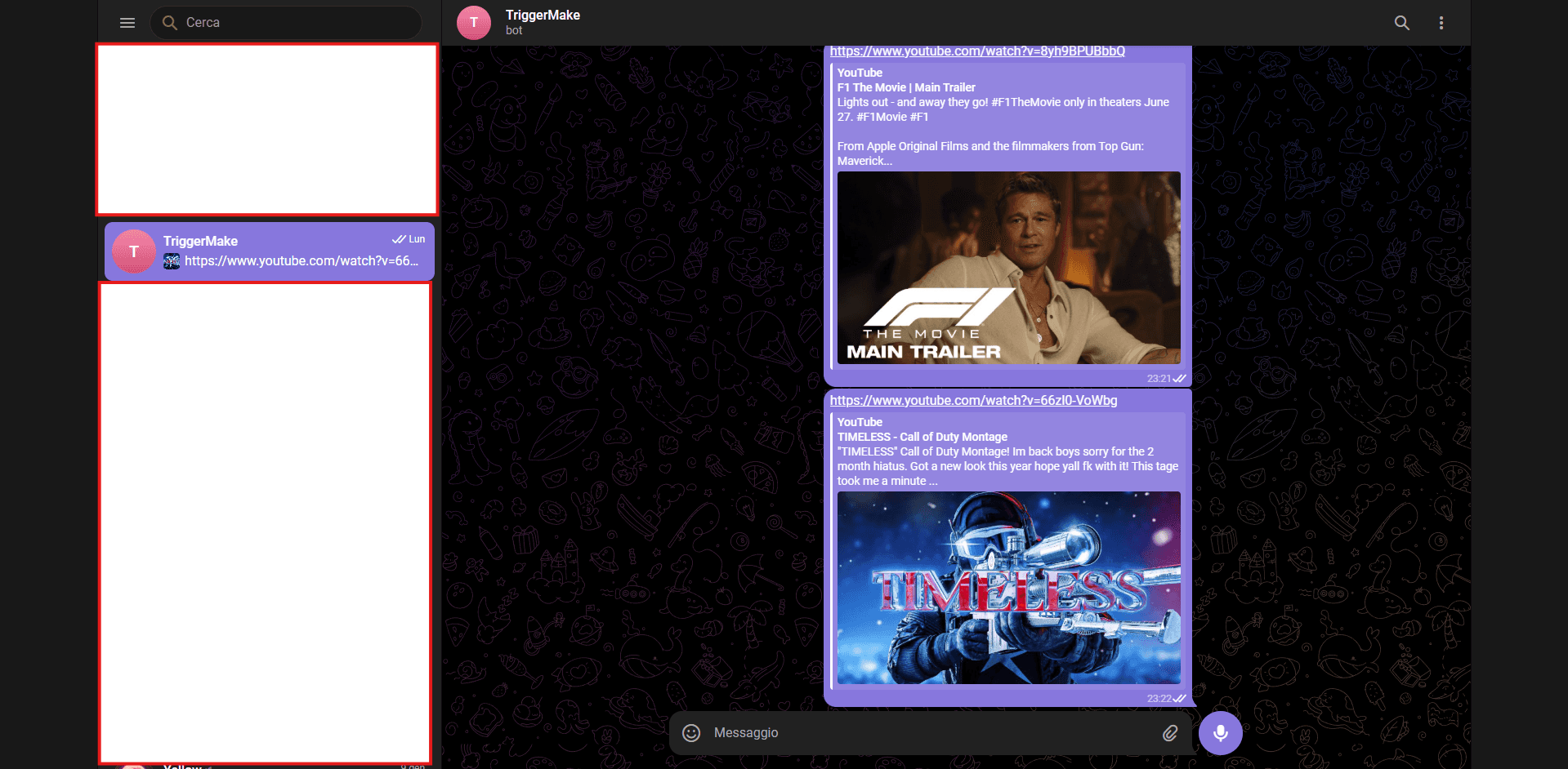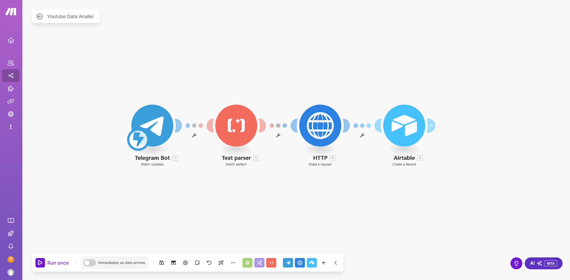 The user simply sends a video link in a Telegram chat connected to a Make scenario.